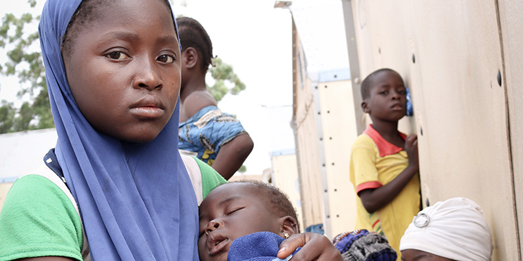 Sporting a blue hijab, 12-year-old Khadidja* carries her baby brother Ibrahim*. “I remember everything,” she says, her face prematurely tightened by events she was too young to witness.