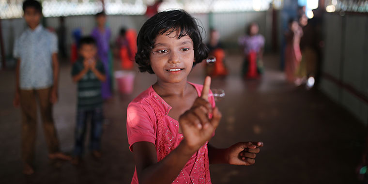 Five child-care spaces set up by SOS Children’s Villages Bangladesh in February 2018 provide educational and recreational activities, plus nutritious food, for 350 children each day. More than half of the 909,000 Rohingya living in refugee shelters are children.