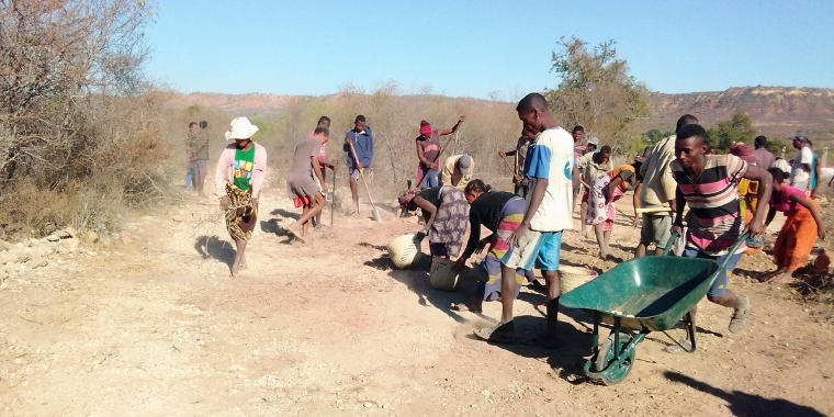 Five times a week, Soavelo joins a group of men and women to construct a road that joins Ampakabo and Ranonda to Anarabe in Betioky. The workers receive 15,000 Ariary (4 US dollars) per week, the equivalent of 20 cups of rice or 15 kilos of cassava.