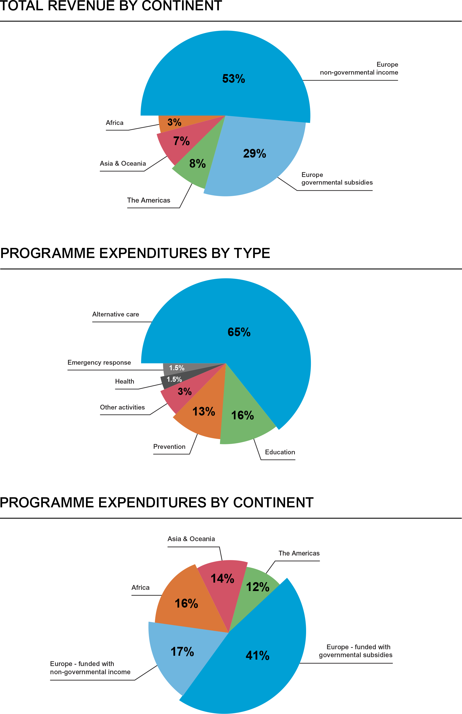 The war in Ukraine disrupted food and fuel supplies on a global scale last year, resulting in significantly increased inflation worldwide. This, combined with unfavourable developments in exchange rates, caused increased costs across nearly all areas. Overall, the year saw total spending rise by 8%. Total expenditure in 2022 was € 1.28 billion. The biggest increase was in the Americas, where total programme expenditures rose by 17%, followed by an increase of 12% in Africa. In line with our strategic focus on preventing family breakdown, spending on family strengthening services increased by 14%, mainly in Europe, Africa and the Americas, enabling us to reach 13% more families in 2022. Direct spending on COVID-19 response was only a minor component compared to 2021. Yet overall, there was a significant increase in humanitarian action spending (167%), reflecting a rise in crises facing the children and families we support. Among other places, we funded emergency projects in Ethiopia, Haiti, Pakistan, Somalia, and Ukraine and neighbouring countries.