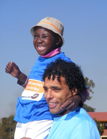 Van Hooijdonk, who was capped 46 times for the Dutch national team, and noted for his spectacular free kicks, trained a group of boys at goals. He was full of joy as he shared his time and expertise, while making the girls giggle with his playful winks. Thami (13) from the Mamelodi community said, "Playing soccer keeps us off the streets. Today we learnt to juggle, shoot and many other ball skills."