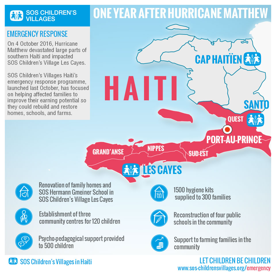 “Since Hurricane Matthew struck Haiti a year ago, we have reached out and supported children and families both in the SOS Children’s Villages and in the wider communities. Our work has focused on helping affected families restore their livelihoods, working with children and their families in our community centres, and on providing supplies to meet families’ immediate needs right after the hurricane caused considerable destruction,” said Darius Celigny, National Director of SOS Children’s Villages Haiti.