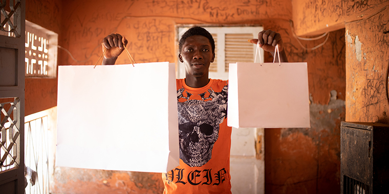 Mouhamed is a 22-year-old entrepreneur who recently started his paper bag and gift boxes making business with several childhood friends. They aim to make a living as well as transform their community.