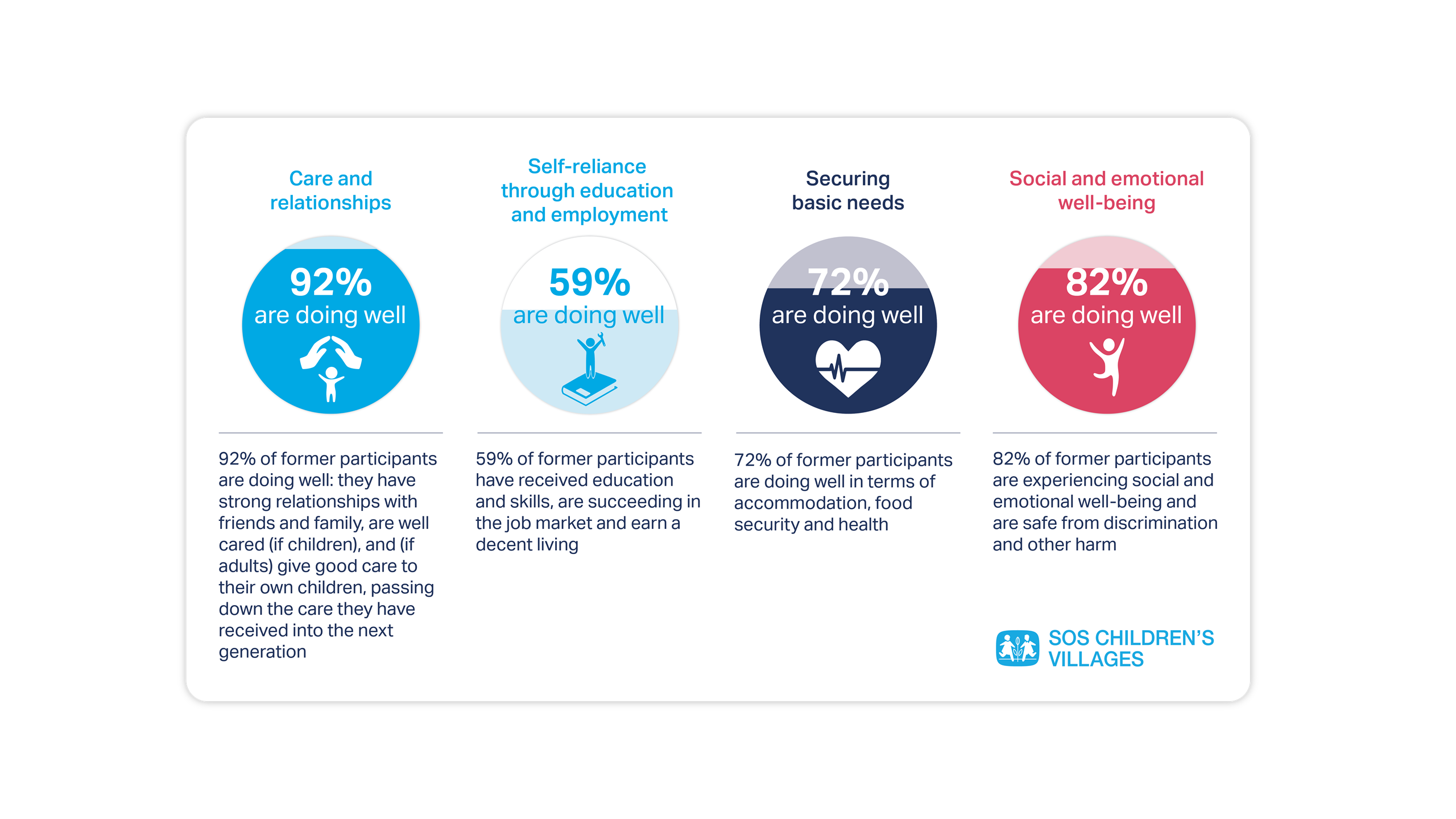 The publication illustrates the impact of our services in four key ways: breaking the cycle of separation and abandonment through care, enabling self-reliance through education and employment, securing basic needs and creating the foundation for a happy life.