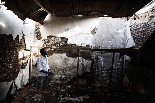 Half a year after leading the daring escape from armed rebels, SOS Youth Leader Isaac James went back to the children's village in Malakal and witnessed the destruction wreaked by the fighters. Here he is standing in the former village store. Photo: Till Muellenmeister.